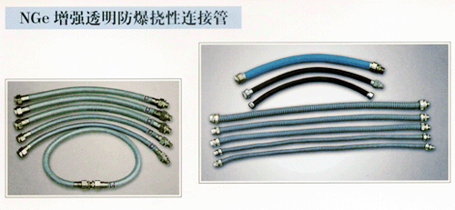 我廠生產的NGe增強透明防爆撓性連接管、防爆標志、ExeII防爆合格證號CE001140它除具有同類產品的性能之外,還具有外形美觀、耐用、可撓性好、結構牢固可靠,軟管兩端為鋼制螺紋活接頭,兩端為壓口,表面鍍鋅或鍍鉻。軟管長度與接頭螺紋可根據用戶要求制作。